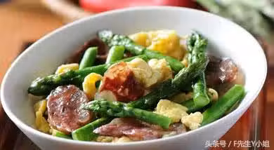 2、鍋中放油,先下火腿翻炒一下,聞到香味後,把火腿撥到一遍,倒入雞蛋液小火煎,待雞蛋凝固後,用鍋鏟弄散,這時,再將蘆筍倒入,三者混合起來翻炒一下撒入少量鹽即可出鍋。