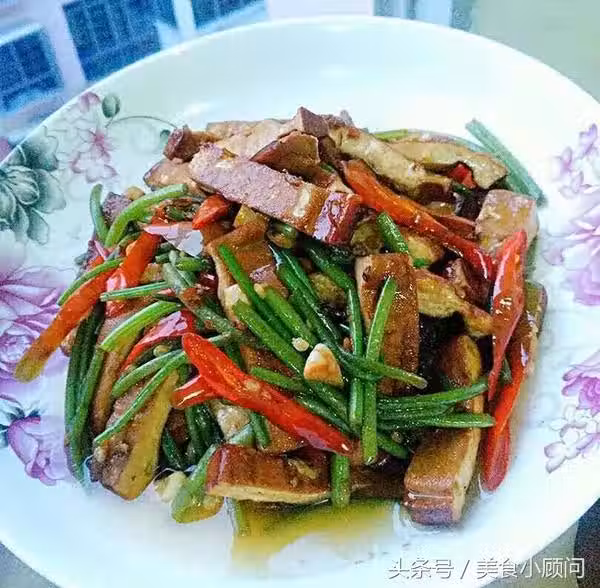 3.香乾洗凈切條,辣椒洗凈切斜片,蒜籽去皮洗凈切碎