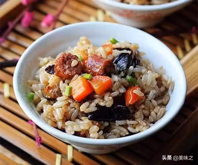 大米250g、臘腸150g、香菇6朵、胡蘿蔔200g、蔥適量、姜適量、生抽適量、鹽適量、糖適量、料酒適量、雞粉適量、香油適量。