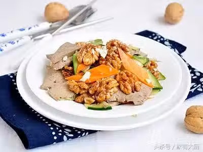 鹵豬肝180g 核桃12顆 黃瓜1根 芝麻油 蒜 胡蘿蔔米醋 醬油 辣椒油 鮮味汁適量