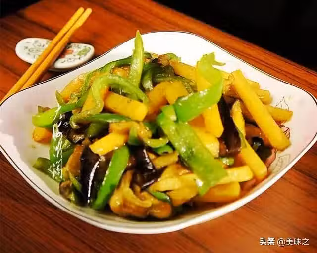 青椒1個、辣椒1個、茄子1個、土豆1個、油適量、鹽適量、蔥適量、五香粉適量、味極鮮醬油適量、蘑菇粉適量。