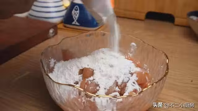 3、接著倒入少許的玉米澱粉,用手給它抓拌一下,讓每一塊雞胸肉上都裹上澱粉,接著放入少許的食用油,把味道鎖在雞胸肉裡面,抓勻以後給它腌制上10分鐘。
