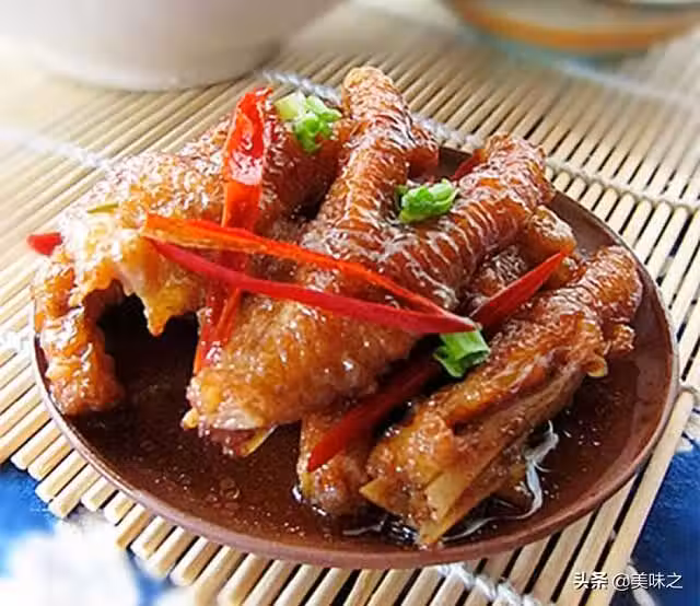 雞爪、干辣椒、花椒、香蔥、蒜粒、香葉、洋蔥、八角、白醋、生抽、鹽、胡椒粉、蜂蜜、老抽、雞精、糖、蚝油、麻油。