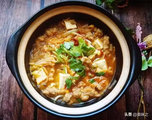 白菜適量、豆腐一小塊、黃豆芽適量、小酥肉適量、粉條適量、花生油適量、姜適量、麻椒適量、干紅辣椒適量、火鍋底料適量、鹽適量、雞精適量、蔥適量。