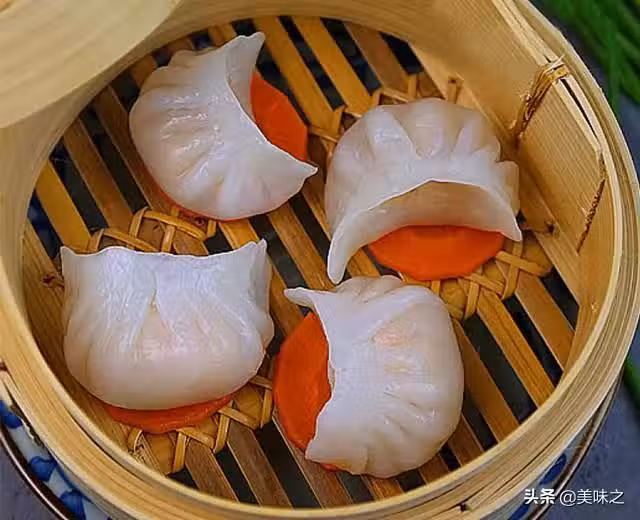 10、蝦餃全部捏好後逐個放到胡蘿蔔片上。開水上鍋,大火燒7-8分鐘即可關火。然後趁熱開動吧,味道非常好哦。