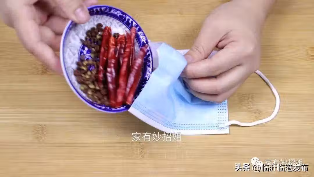 花椒和干辣椒是我們家裡常備的調味料,其實也可以利用它們來預防大米生蟲。只需要拿上一個一次性的口罩,用剪刀將口罩的一端剪開,然後抓一把花椒和干辣椒放在口罩裡面,接著再將口罩的袋口紮緊,那麼這樣一個預防大米生蟲的口罩包就製作好了。