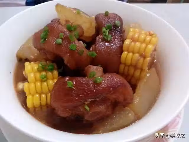 豬蹄、玉米、冬瓜、生薑、大蔥、紅豆腐乳、大料適量、香葉適量、干紅辣椒適量、料酒適量、鹽適量、味精適量。