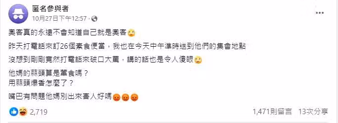 據《民視新聞》報導,原PO在近日在「匿名公社」上發文抱怨,透露昨天接到電話,對方說要訂26個素食便當,於是自己也在今天中午準時送到了客人的集會地點。