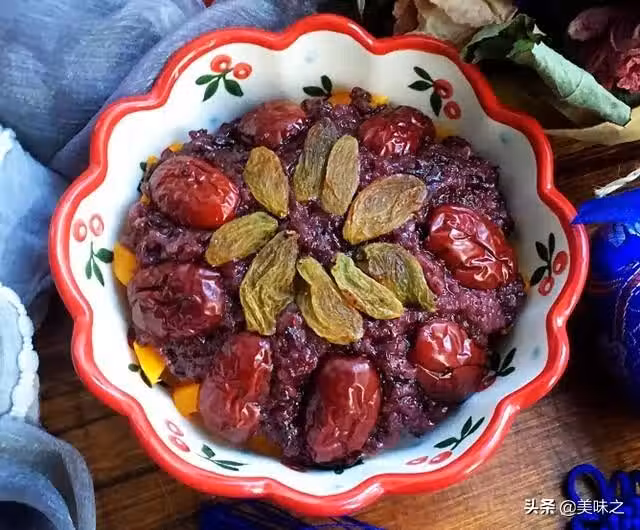 紫糯米飯一碗、紅棗適量、葡萄乾適量、板栗南瓜適量。