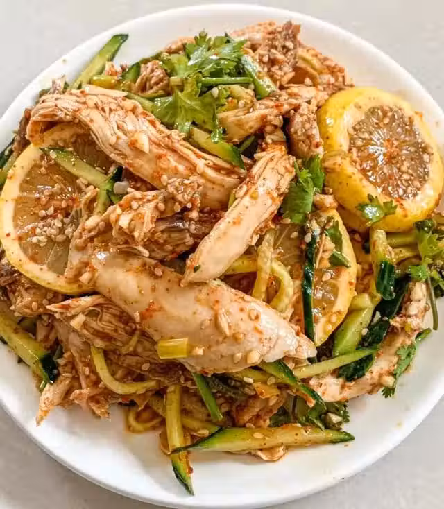 (4)將雞腿肉撕開放入盆中,再放入黃瓜絲、香菜、檸檬片,倒入調好的料汁。