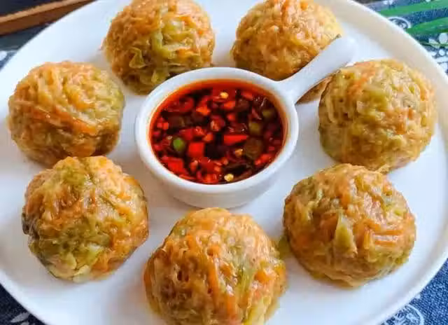 (7)將料汁小碗放入菜糰子中間,蘸著蘸料吃即可,做法肯定低卡飽腹好吃不胖!