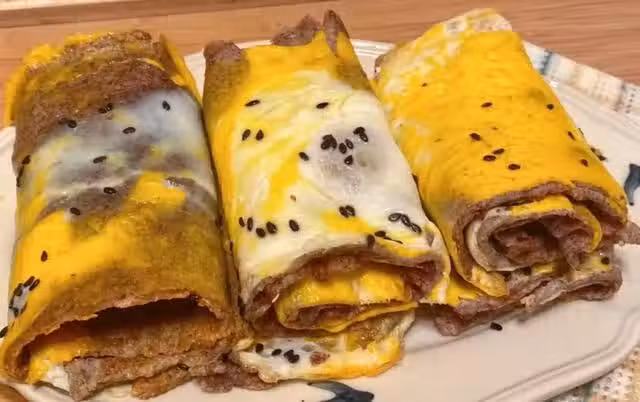 (2)平底鍋倒入少許油,油熱倒入一勺麵糊攤開,煎至麵糊定型翻另一面。
