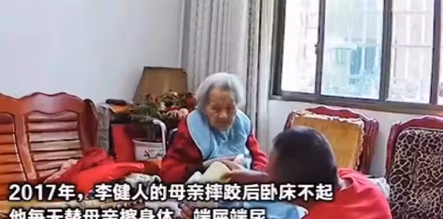整個過程,李健人溫柔地抱著母親,給她整理衣服,陪著她說話。