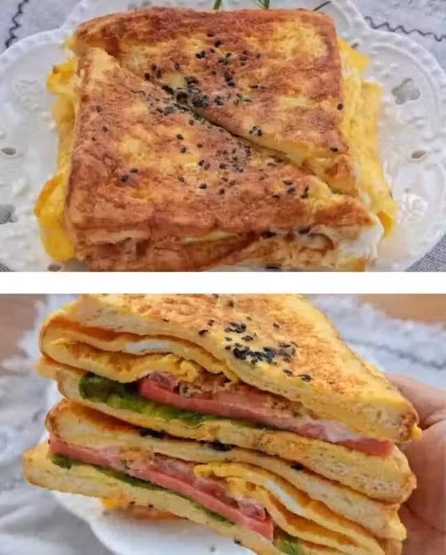 (3)在煎凝固上色,將雞蛋餅向里疊起來,再將兩片吐司疊起來,包裹上保鮮膜固定,切開就可以吃啦,簡單又營養孩子愛吃✅