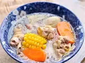 3、砂鍋或者電飯鍋放水,把雞肉和玉米,胡蘿蔔一起放進去煲湯。若是電沙煲,大約兩個小時,若是電飯煲,一個小時即可。檢驗方法可以看雞肉是否熟爛。