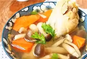 2、燒鍋下油,放入紅蘿蔔、蘑菇翻炒數次,煮入清湯,用中火煮。