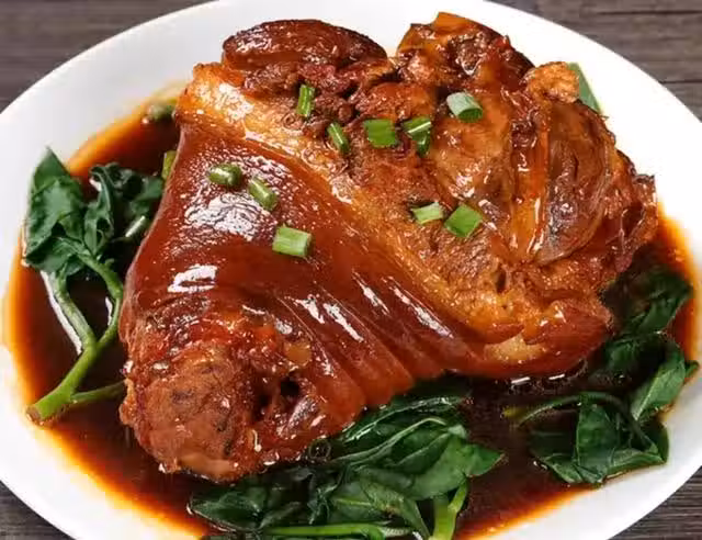 (4)至湯汁濃稠大火收汁,盤中底部鋪上一層生菜,上面放入肘子即可,做法簡單入口即化,超好吃大人小孩都喜歡吃!