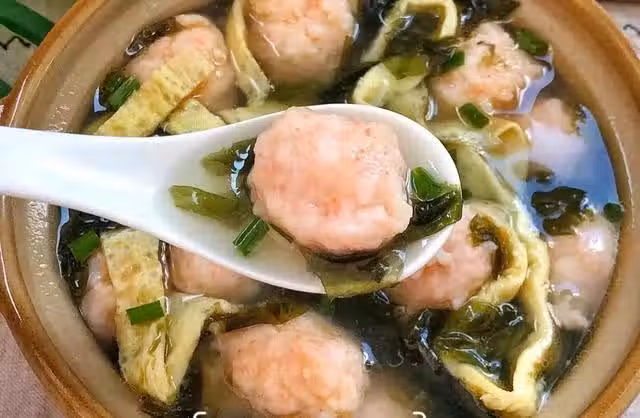 (5)鍋中倒入適量清水,加入適量的薑片煮沸,放入紫菜、雞蛋條、蝦滑煮開。