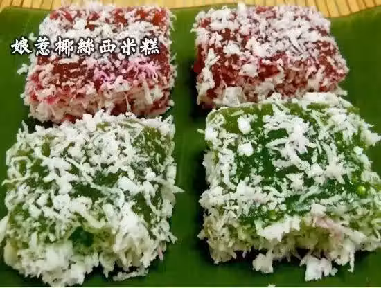 珍珠西米 115g,水 2 1/2碗 (用量杯,1杯200ml),糖 140g,紅,綠色素 各1/2茶匙 (綠色的可用Pandan香精),香草精 1/2茶匙,燕菜粉 3茶匙,椰絲 227g,鹽 1/2茶匙