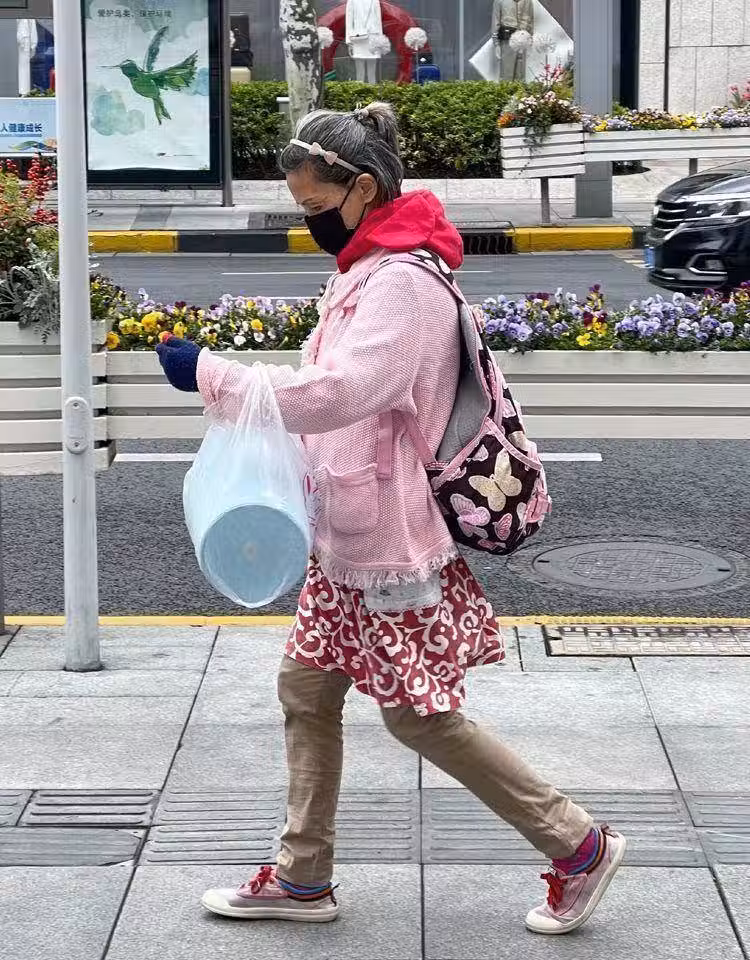 這位上海奶奶身穿工裝風衣,搭配闊腿牛仔褲和帆布鞋,反戴棒球帽個性又隨性,比小姑娘還時髦。
