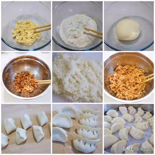 7,醒好的麵糰切成小劑子,擀成餃子皮,包入餡料,捏成餃子。