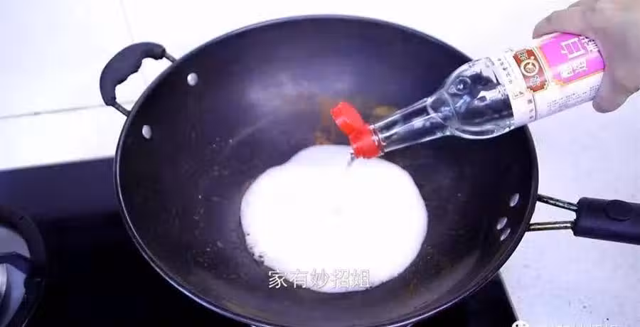 然後再往裡面擠入一點洗潔精,也不需要太多,2~3滴就可以了。接著,我們再往鍋中倒入多一些的白醋,白醋有軟化的作用,可以軟化鍋中一些頑固的污漬。