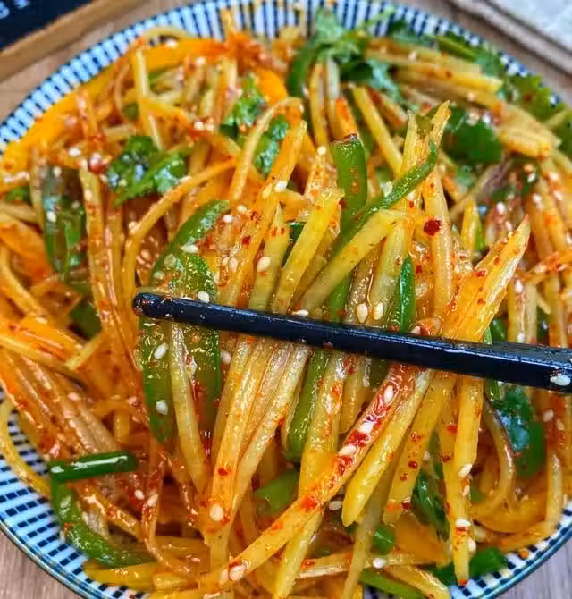 (4)將瀝干水分的土豆絲盛入盤中,再淋上調好的料汁攪拌均勻。