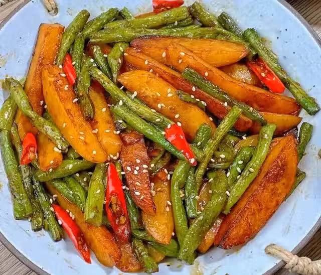 (3)鍋中熱油下入土豆條,小火煎至土豆表面變色,下入豆角翻炒至變軟盛出備用。
