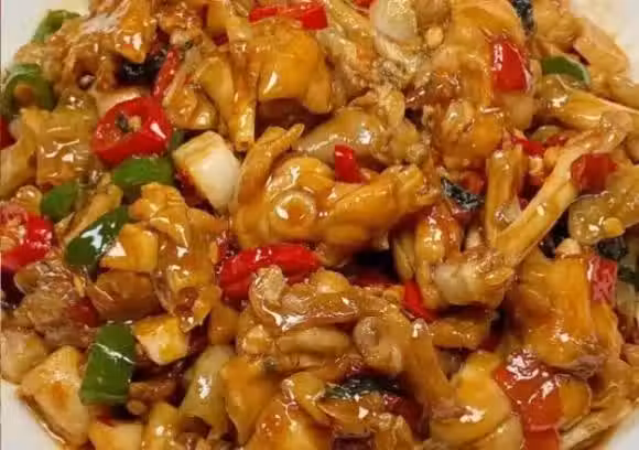 (5)再放入牛蛙,翻炒片刻,再倒入調好的料汁,大火翻炒均勻,至食材熟透入味,大火收汁,關火出鍋,盛入盤中即可開吃!