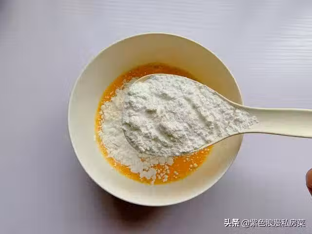 3.雞蛋打入碗中,打散,再放一勺麵粉,一勺玉米澱粉,少許鹽,適量的胡椒粉。