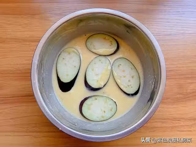 4.將茄子放入麵糊中,使茄子蘸滿麵糊。