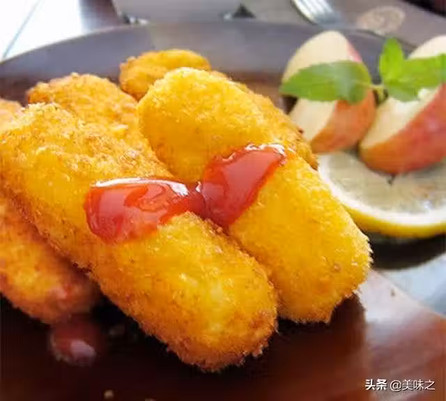 8、鍋內熱油,入裹好的土豆指炸至金黃,撈出用吸油紙吸去多餘油分即可。