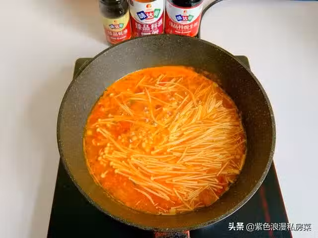 6.放入金針菇,煮熟後撈出,放入盤底。