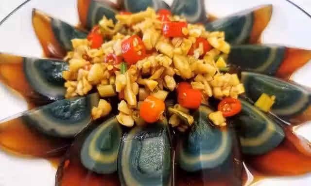 (3)將切好的皮蛋,均勻地擺入盤中,再倒入調好的料汁,再淋入一勺熱議,激發出香味,靜置一會,待皮蛋入入味即可。