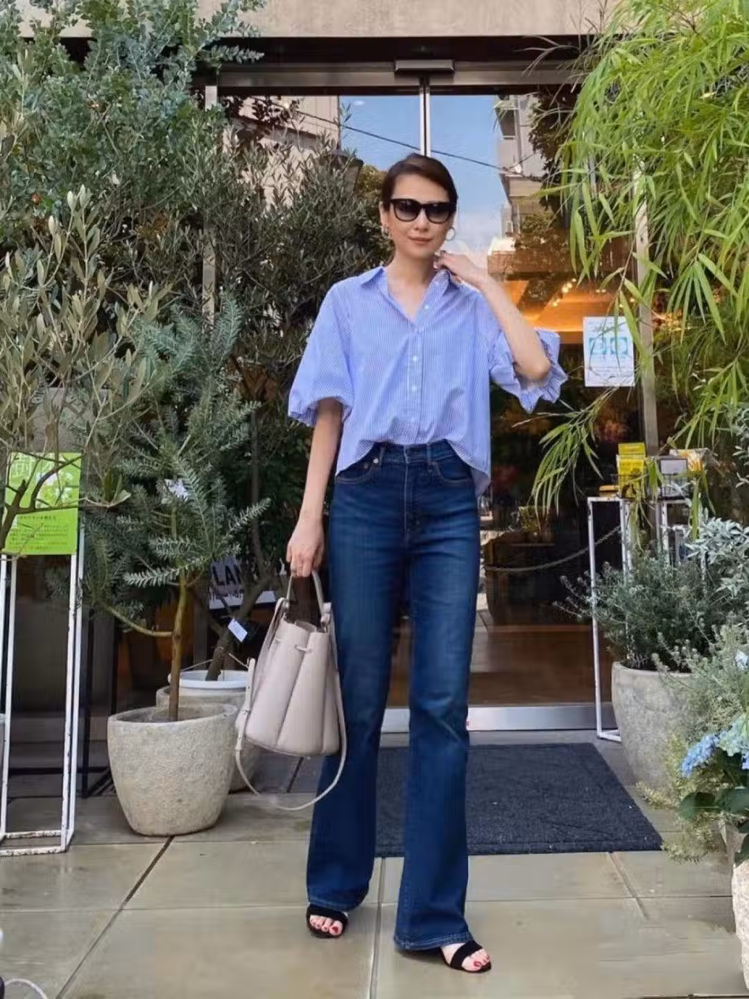 2、襯衫+牛仔褲襯衫與牛仔褲一者簡潔一者休閒,兩種單品屬於互為彌補的關係,擔心襯衫配煙管褲過於正式的女人,可以採用這種搭法,出街輕鬆兼顧清爽與時髦感。但襯衫別太一板一眼,用泡泡袖襯衫、A字版型襯衫取代基礎款襯衫,更容易穿出灑脫隨性的好氣質。