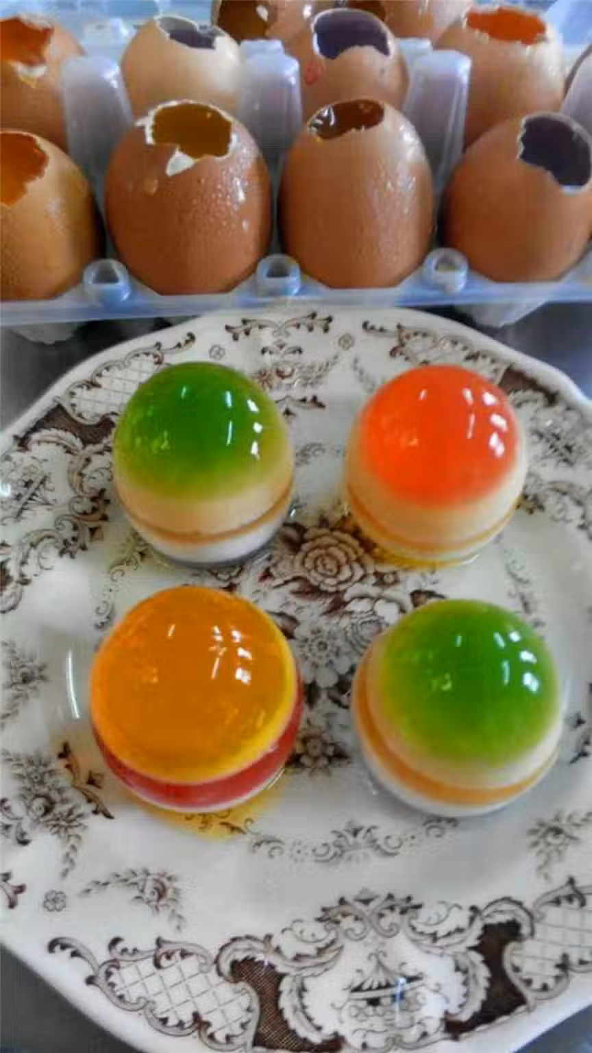 一層顏色一層椰漿倒進雞蛋殼裡記得等待凝固後才倒第二層。