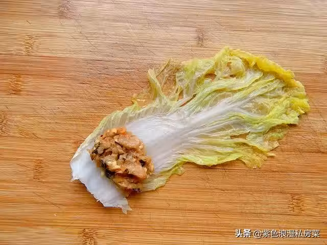 5.取適量的肉餡,放入娃娃菜中,卷錢碼入盤中。
