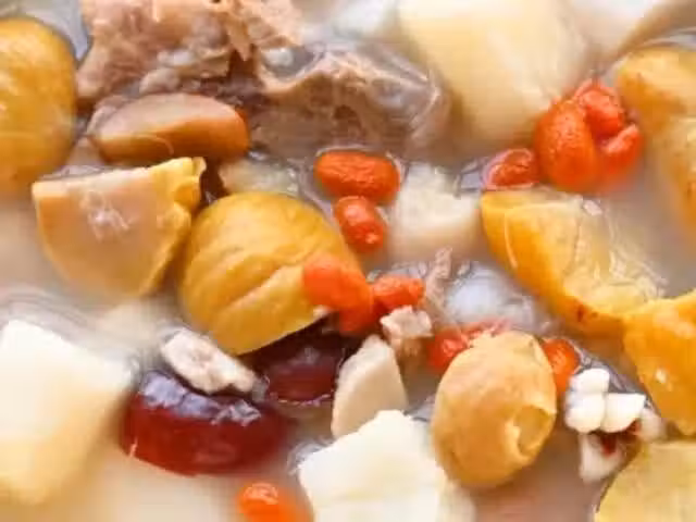 3、將豬骨、山藥、板栗和其他湯料都放入鍋中,加入足量的清水,蓋上蓋子燉煮一個小時。煮好後,加入食鹽調味,撒上枸杞子攪拌均勻即可出鍋開吃。