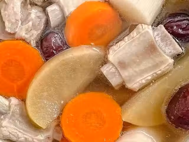 3、將排骨、山藥、胡蘿蔔和薑片放入湯鍋中,加入足量的清水,蓋上蓋子燉煮四十分鐘。接著放入蘋果繼續燉煮十五分鐘。