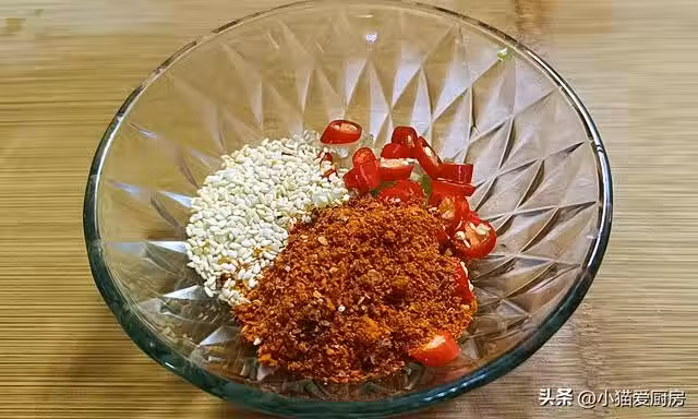 【步驟二】:依次放入白芝麻1勺、五香辣椒麵1勺,攪拌均勻,防止熱油把辣椒麵炸糊了。
