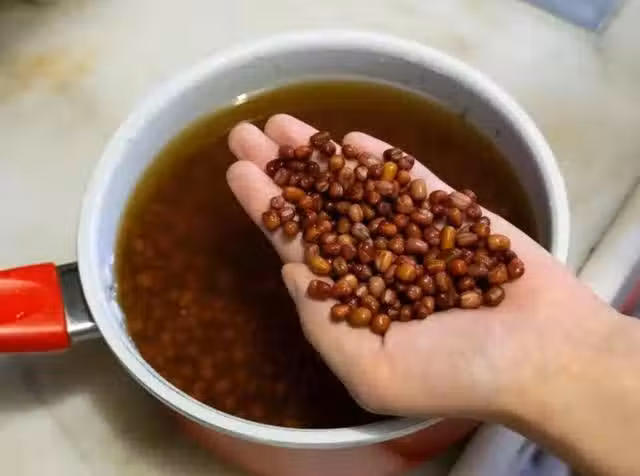 陳皮也是稍微沖洗乾淨,然後拿個小碗,大約浸泡40-60分鐘,等到整塊果皮變軟就可以。紅豆泡好後,撈上來備用。陳皮需要刮掉裡面的囊,囊一定要刮乾淨,不刮乾淨的話,等下整鍋紅豆都會瀰漫在一股揮之不去的苦澀味。