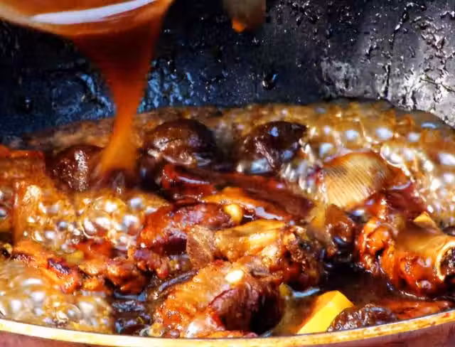 第四步,看到排骨表面微微焦黃,將糖醋汁倒入鍋中,快速翻炒下,同時加上沒過排骨的開水,大火煮開後,轉至小火慢慢燉煮;