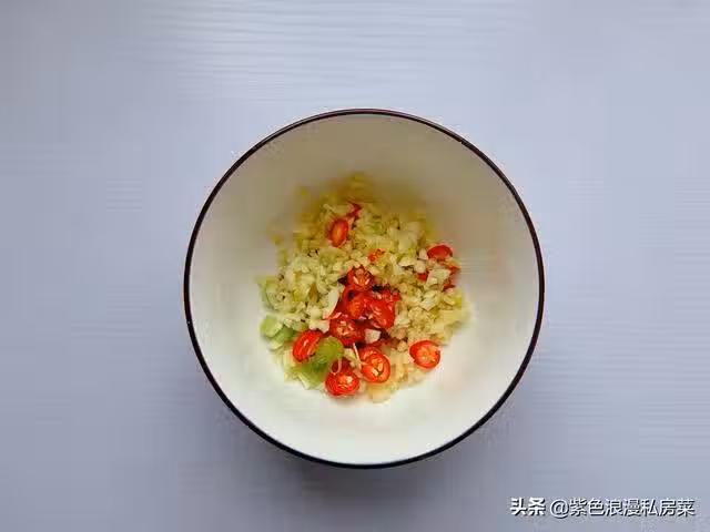 4.大蒜切碎,小米椒切圈,放入碗中。