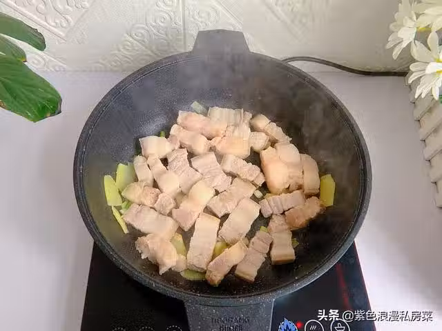 3.鍋中放少許油,放生薑爆香,放五花肉煸炒出油,不過不要炒時間過長。