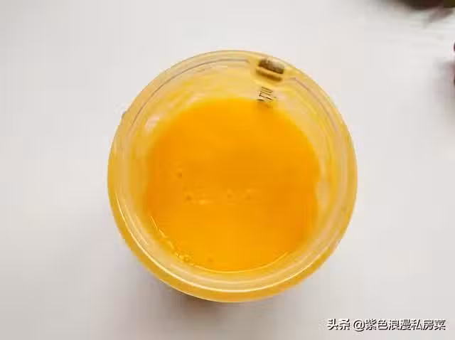 4.煮西米的時候,我們來做芒果奶昔,將切好的芒果一半放入榨汁機中,倒入椰汁,喜歡吃甜的可以放一點白糖,也可以不放,因為芒果已經很甜了,打成芒果奶昔,這樣比直接放椰奶和芒果在西米當中要好喝很多。