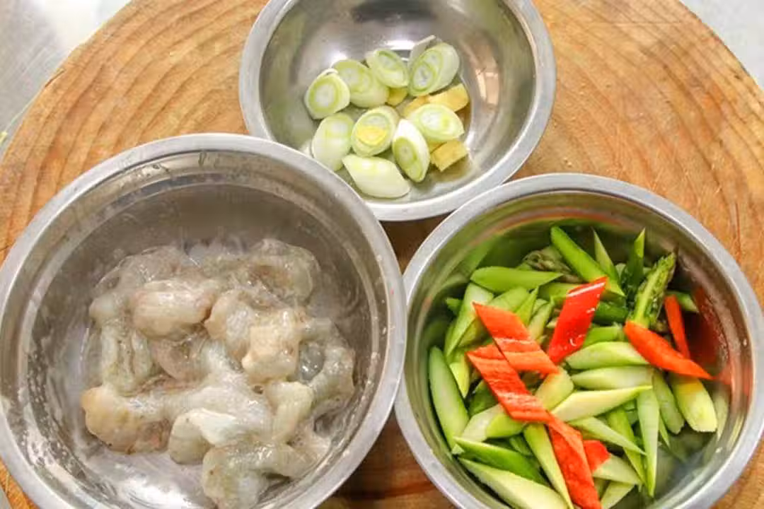 2.蘆筍一小把,洗凈以後切成大小均勻的滾刀塊;紅椒半個切成菱形片、用來配色;蔥姜都切成片備用。