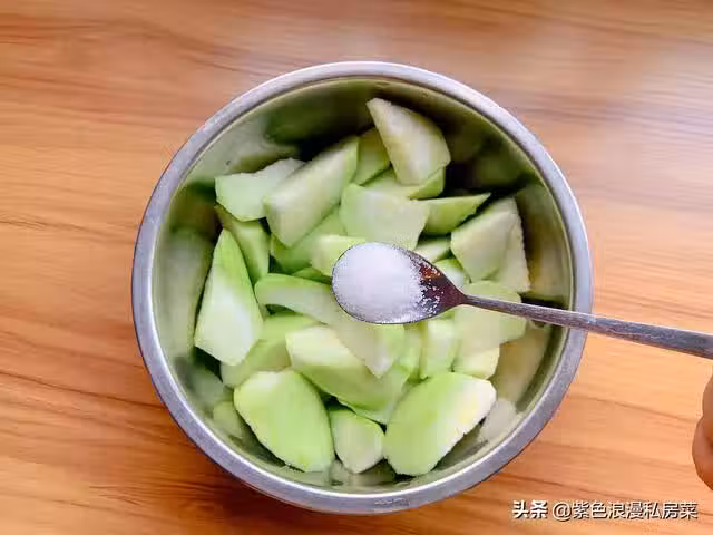 2.絲瓜放入大碗中,放一勺食用鹽,拌勻後腌10分鐘,這一步很重要,絲瓜中放食用鹽,給絲瓜表面形成一層保護膜,這是炒絲瓜不會氧化變黑的關鍵。
