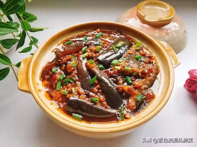 3.茄子蒸軟取出,鍋中放跟平時炒菜差不多的油,放大蒜小米椒爆香,放肉沫翻炒,放一勺豆瓣醬炒出香味,放入茄子,倒入醬汁,大火收汁,撒上香蔥即可。