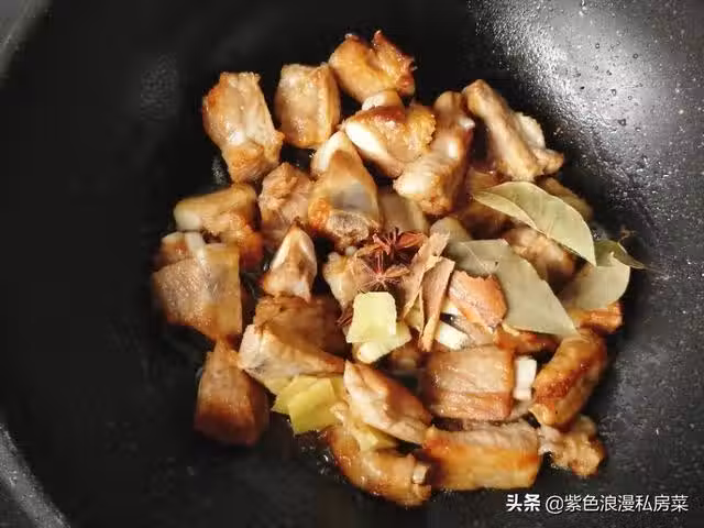 5.放入排骨翻炒,使排骨均勻的裹上糖色,放入桂皮,八角,香葉。