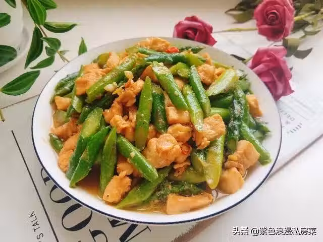 4.鍋中放油,放生薑,大蒜,小米椒爆香,放雞丁翻炒斷生,放蘆筍,放適量的鹽,一勺蚝油翻炒均勻,放雞精即可出鍋。